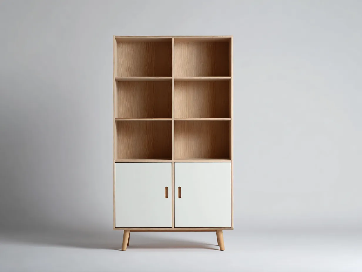 Die offenen Regalfächer ermöglichen eine übersichtliche Präsentation von Büchern und Dekorationen und erleichtern den schnellen Zugriff auf häufig genutzte Gegenstände. Im unteren Bereich befindet sich ein geschlossenes Stauraumelement, das zusätzlichen Platz für Dokumente oder persönliche Gegenstände bietet und für eine aufgeräumte Optik sorgt.
