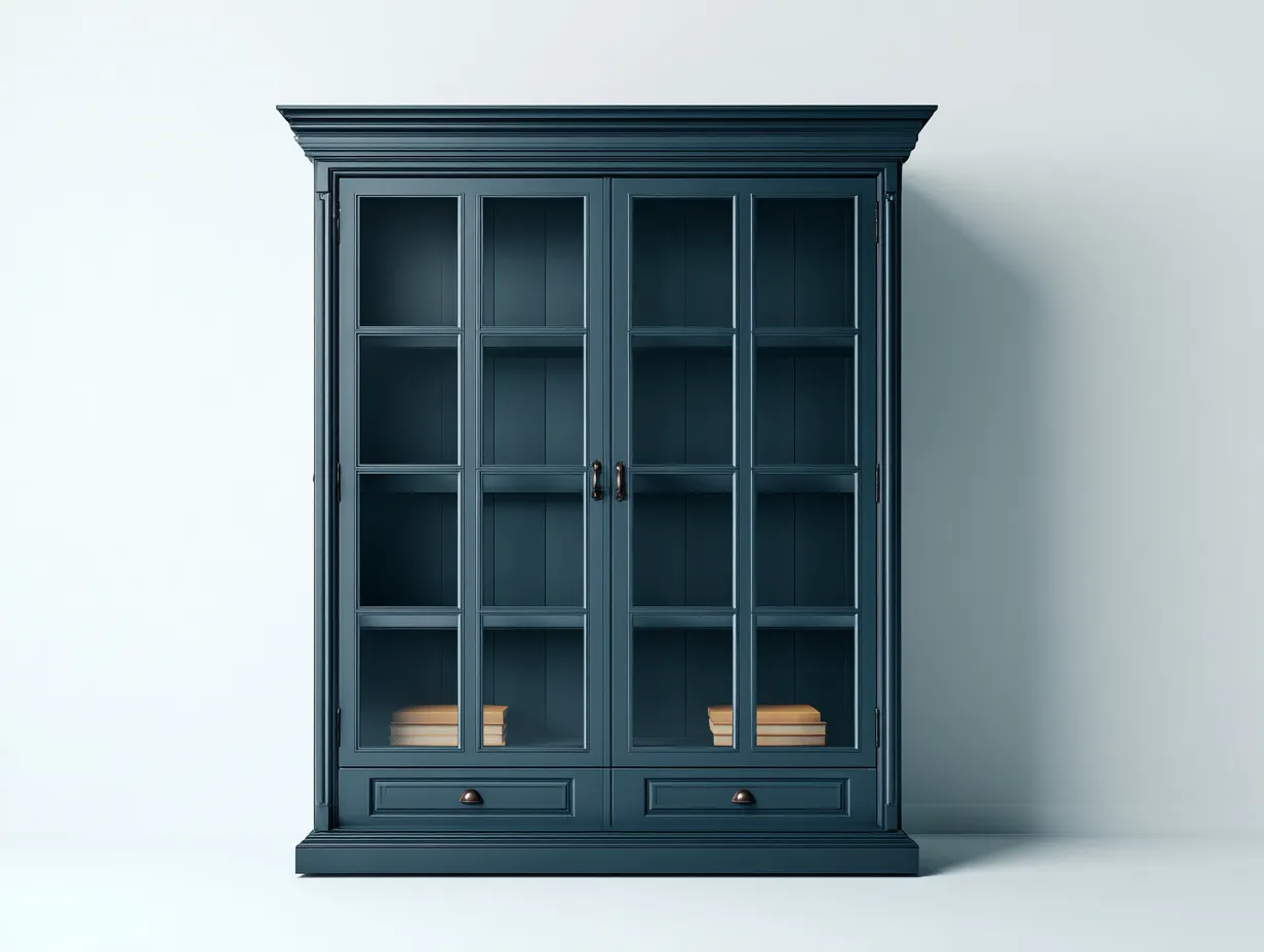 Dieses Bücherregal verbindet klassische Eleganz mit funktionaler Aufbewahrung und eignet sich hervorragend für Wohnräume, Bibliotheken oder Arbeitszimmer. Die verglasten Türen ermöglichen eine stilvolle Präsentation von Büchern und Dekorationsobjekten, während die geschlossene Konstruktion gleichzeitig vor Staub schützt. Die dunkelblaue Oberfläche verleiht dem Möbelstück eine ruhige und hochwertige Ausstrahlung.