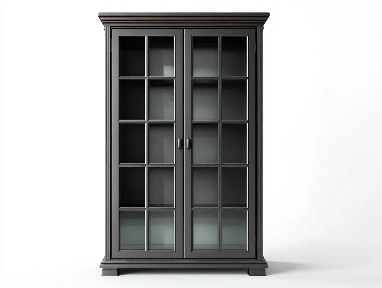 Gefertigt aus Holz und Glas, überzeugt das Möbelstück durch eine solide Konstruktion und eine pflegeleichte Oberfläche in Dunkelgrau. Die Türen sind passgenau gearbeitet und mit gerahmten Glaseinsätzen ausgestattet, wodurch eine harmonische Verbindung aus klassischer Optik und funktionaler Alltagstauglichkeit entsteht.
